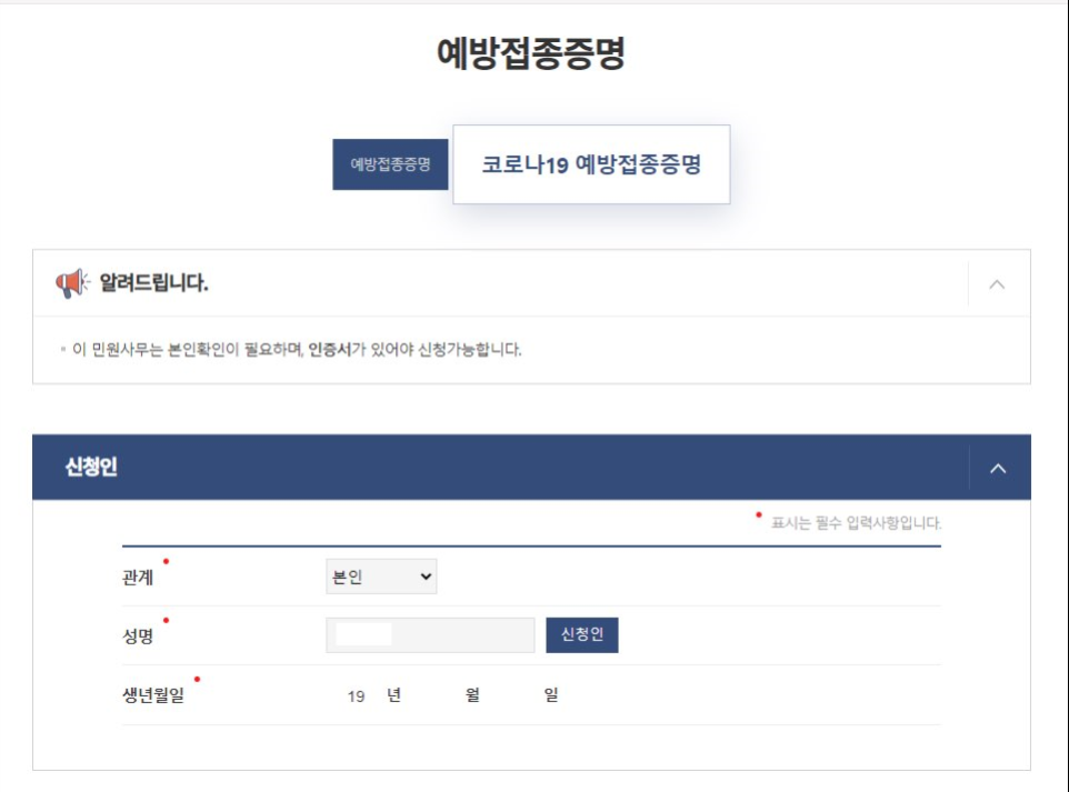다음은 예방접종 증명인데요. 코로나19예방접종증명과 동일한 형태로 진행이 됩니다.