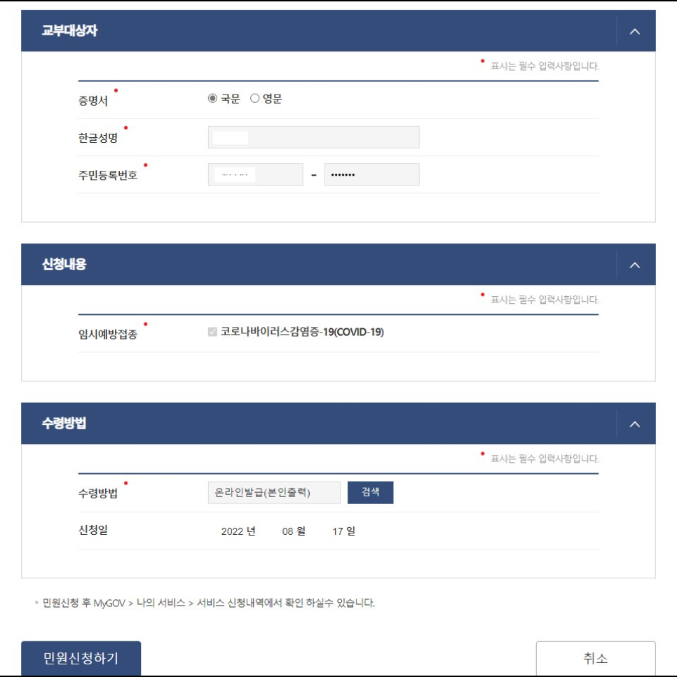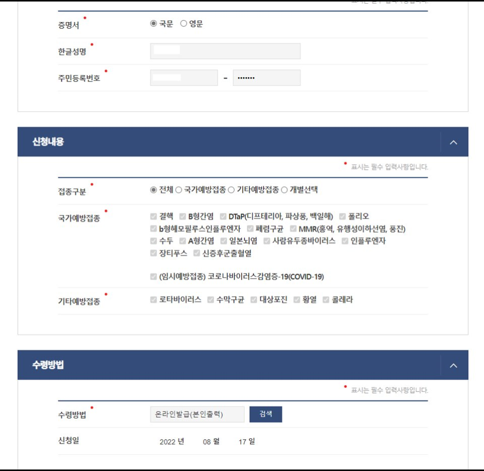 다음으로 증명서 종류를 영어나 한글로 선택할 수 있으며, 이름과 주민등록번호를 기입해주세요. 임시예방접종의 경우 코로나바이러스감영증-19(COVID-19) 항목이 선택되며, 수령방법은 온라인발급(본인출력)으로 하시는게 편하실 겁니다.