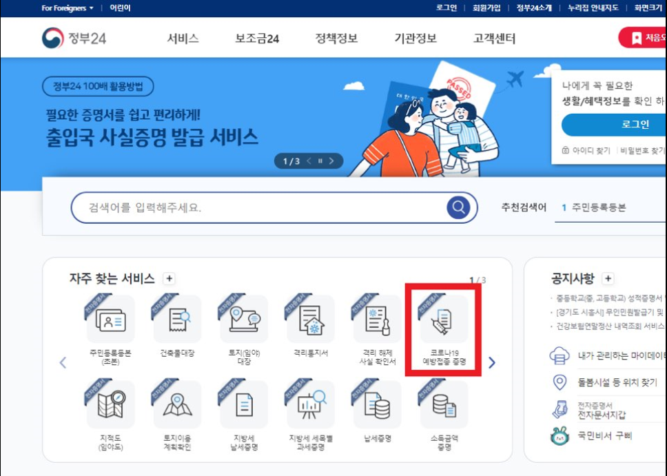 우선 사이트에 접속해 주세요. 홈페이지 메인 컨텐츠 자주찾는 서비스에 보시면 코로나19 예방접종 증명이라는 메뉴가 보이실 겁니다. 클릭해주세요.