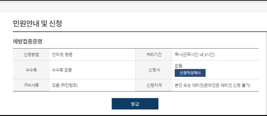 다음으로 민원안내 및 신청 화면인데요. 예방접종증명의 경우 인터넷 신청시 수수료는 없으며, 바로 처리가 됩니다.
